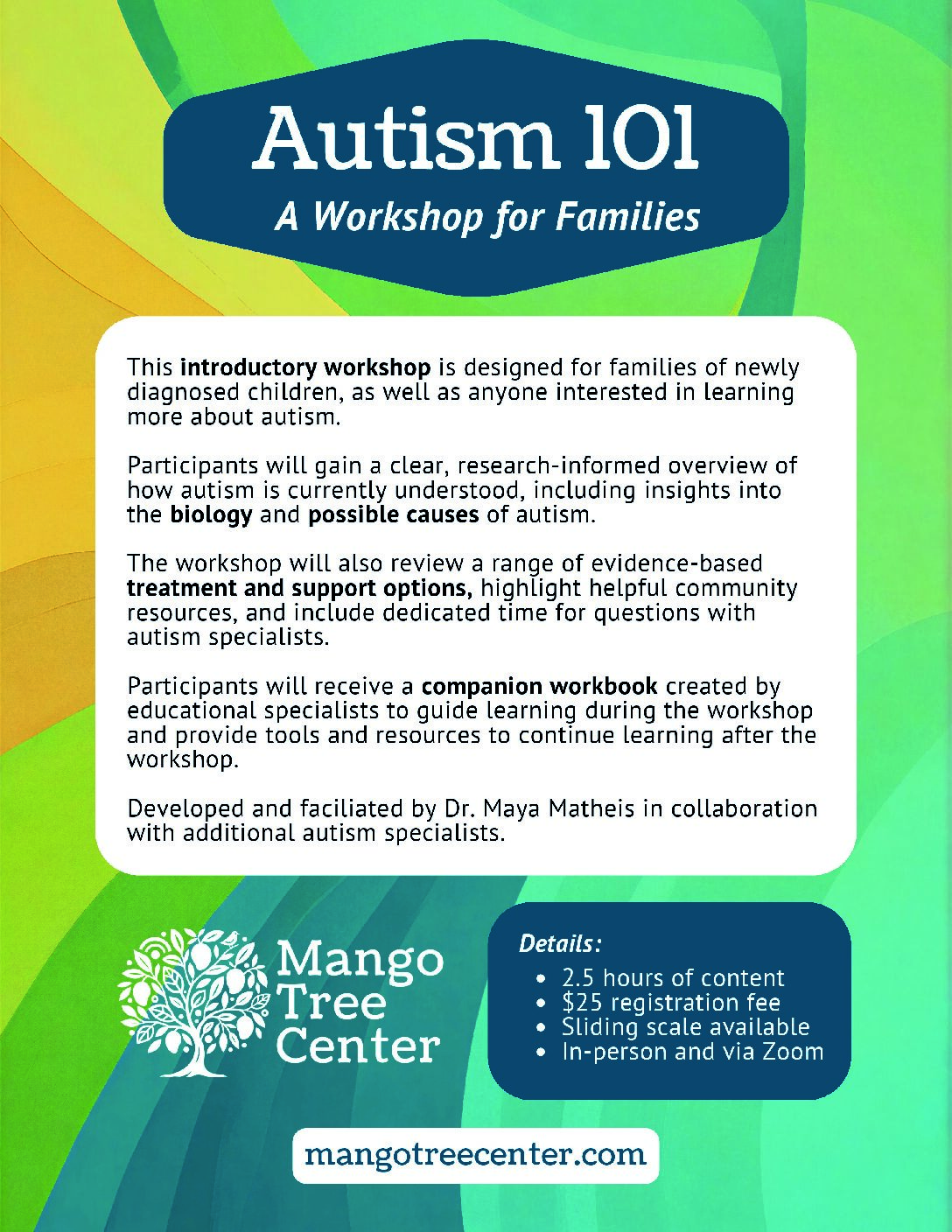The Mango Tree Learning Collective is a community-centered program offering education, support, and connection for families and individuals navigating autism and neurodiversity. Through workshops, support groups, trainings, and online learning opportunities, the Collective brings together expert guidance and practical resources in a warm, accessible environment designed to empower and support families at every stage.